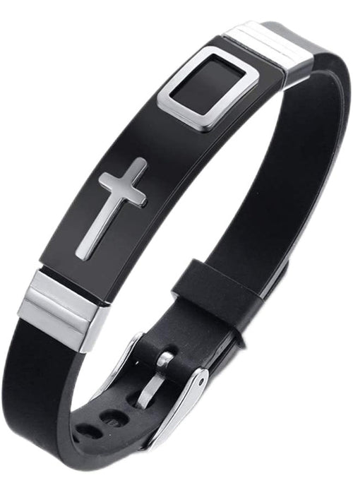 Elevate your style with this Stainless Steel Cross Bracelet, designed for both faith and fashion. Featuring a durable black silicone band, this bracelet offers all-day comfort and an adjustable fit. The stainless steel centerpiece showcases a sleek cross design, available in silver with gold accents or all-silver tones. Perfect as a personal accessory or a meaningful gift for birthdays, anniversaries, or religious occasions. Wear it as a daily reminder of strength, faith, and style.